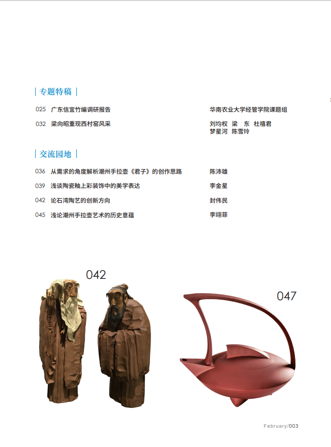 行业资讯 009 2021年广东省工艺美术专业技术人员继续教育培训班在工美港举办 012 张泽锋获全国五一劳动奖章 封面人物 013 文心雅韵一谈邱春林的青花瓷艺术 吕品田 022 复兴传统文化,手工艺可先行一步 邱春林 专题特稿 025 广东信宜竹编调研报告 华南农业大学经管学院课题组 032 梁向昭重现西村密风果 刘均权 梁东 杜植君 梦星河 陈雪玲 交流园地 036 从需求的角度解析著州手拉壶《君子)的创作思路 陈沛雄 039 浅谈陶瓷轴上彩装饰中的美学表达 李金星 042 论石湾陶艺的创新方向 封伟民 045浅论潮州手拉壶艺术的历史意蕴 李闭菲 |