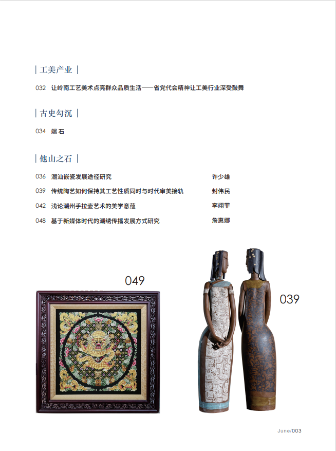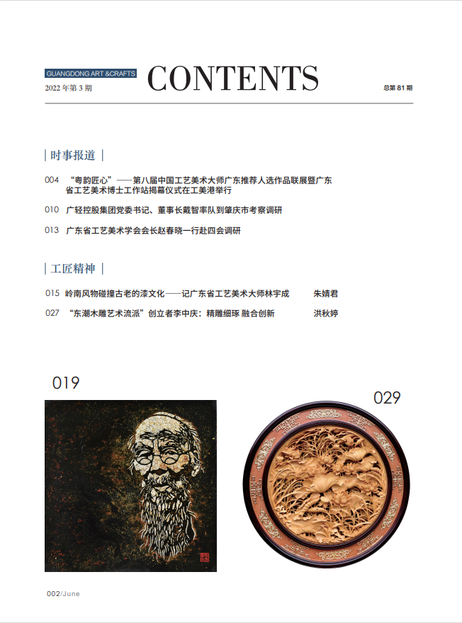 时事报道 004 “粤韵匠心”一第八届中国工艺美术大师广东推荐人选作品联展暨广东省工艺美术博士工作站揭幕仪式在工美港举行 010 广轻控毅集团党委书记、董事长戴智带队到肇庆市考察调研 工匠精神 015 岭南风物碰撞古老的漆文化一记广东省工艺美术大师林字成 朱婧君 027 “东潮木雕艺术流派”创立者李中庆:精雕细琢融合创新 洪秋婷 工美产业 032 让岭南工艺美术点亮群众品质生活一省党代会精神让工美行业深受鼓舞 古史勾沉 034 端石 他山之石 036 测汕嵌瓷发展途径研究 许少雄 039 传统陶艺如何保持其工艺性质同时与时代审美接轨 封伟民 042 浅论潮州手拉壶艺术的美学息蕴 李翊菲 048 基于新媒体时代的灌绣传播发展方式研究 詹惠娜 |