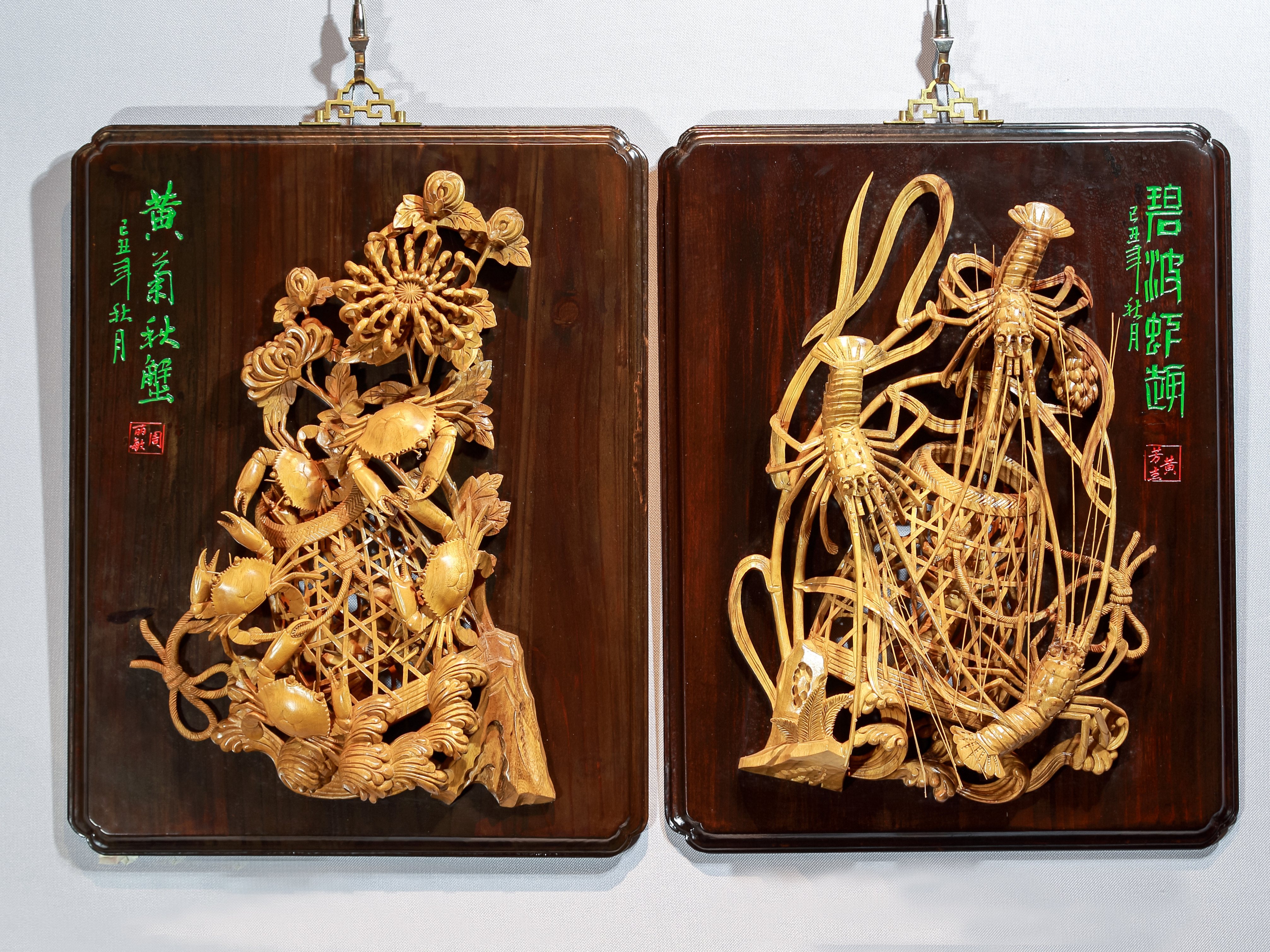 《碧波虾趣》 作品运用潮州木雕传统的通雕技艺,题材选用盛夏时期,河畔捕虾的景物,铺叙一幅虾嬉戏于碧波间的夏景图。生动形象,又贴近日常,富有生活情趣; 《黄菊秋蟹》 作品运用潮州木雕传统的通雕技艺,题材选用金秋时“菊黄蟹肥”的应景之物——秋风一起,菊黄蟹肥,持螯赏菊,意境深远,又贴近日常,富有生活气息。 |