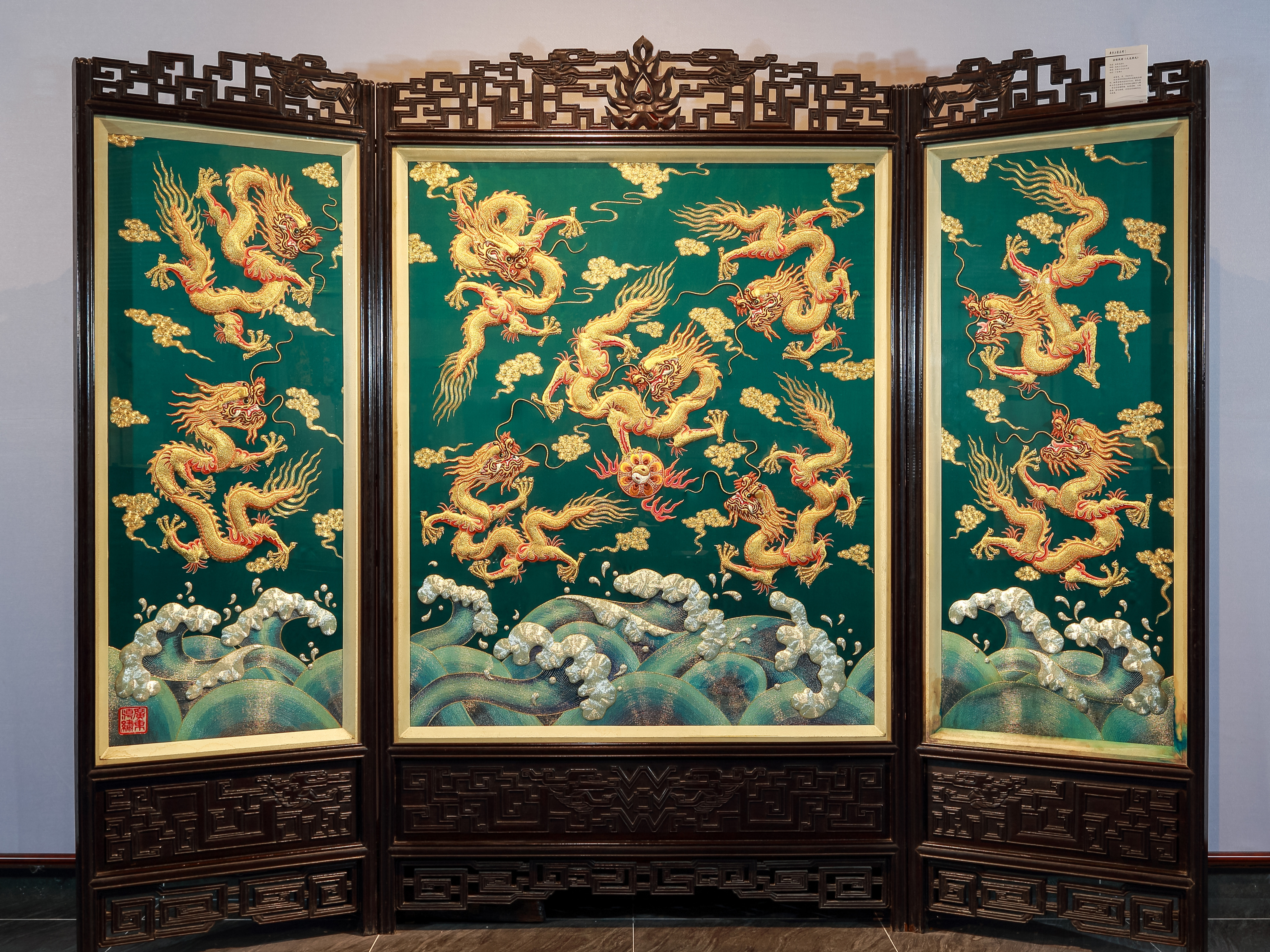 作品用999的纯金线和纯银线来绣的,耗费金线约达20万米长。整体画面上为九条动态不同的蛟龙腾空飞舞,其色彩浓郁鲜艳、纹理清晰、立体感强、绣艺独特,具有高贵典雅的艺术效果。1982年获得了全国工艺美术作品百花奖的金奖。